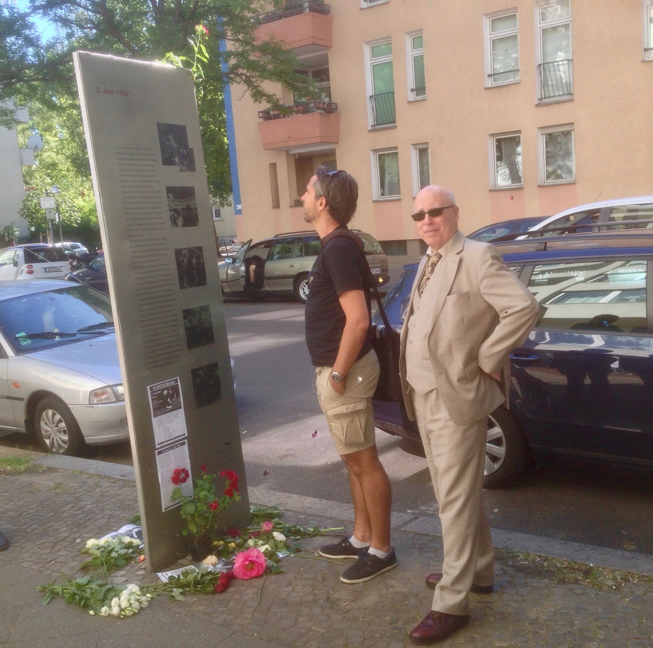 Aus Anlass des 53. Todestags am Dienstag, dem 2. Juni 2020, mache ich den Beitrag hier erneut und im Weiteren textlich unverändert zugänglich. Aus Urheberrechtsgründen ist das 2017 verwandte Foto im Folgenden nicht enthalten, stattdessen sind es einige Aufnahmen vom 2. Juni 2017, als ich am Tatort, der längst ein Gedenkort ist, eine Blume niederlegte. Viele andere taten es ebenso.